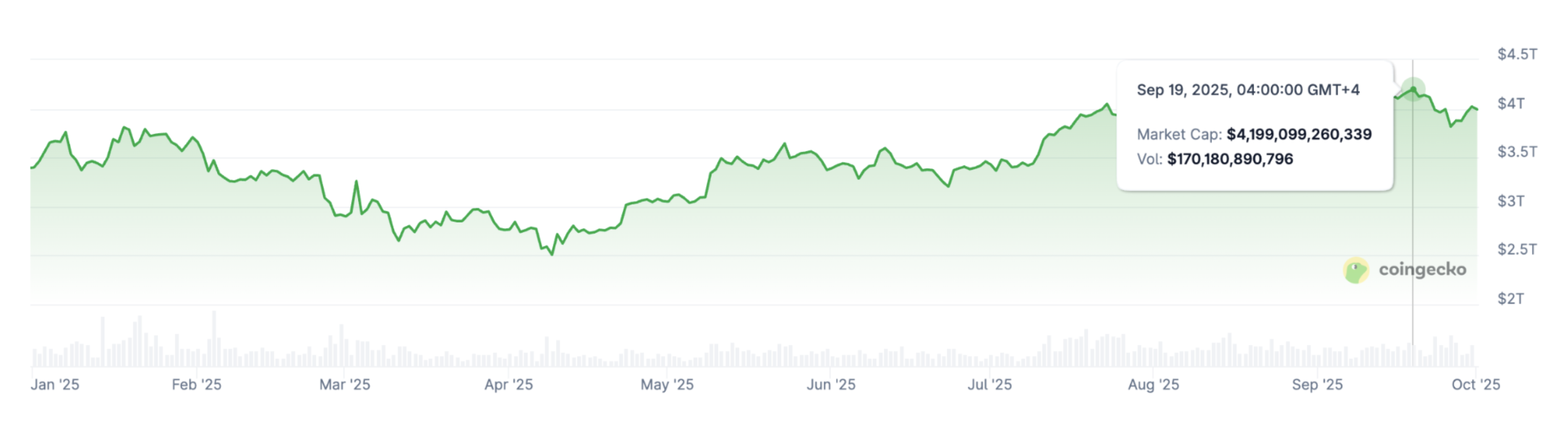 Overall the market cap peaked towards August’s all-time high of $4.25 trillion, reflecting the continued and increased positive sentiment in the market.