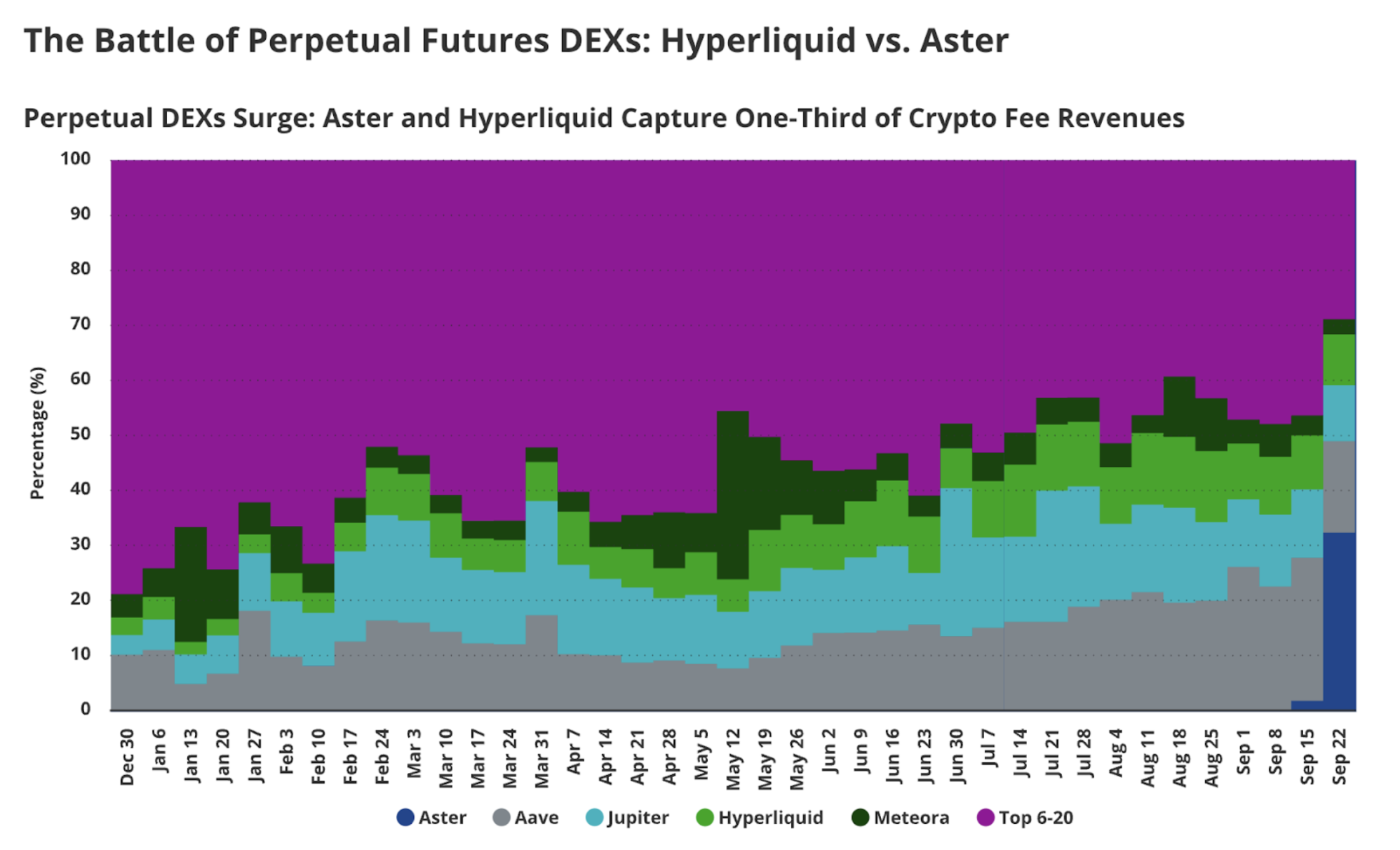 On product level, the DeFi derivatives also saw notable shifts in September. Perpetual futures DEXs such as Aster and Hyperliquid have rapidly gained traction, capturing roughly one-third of total crypto fee revenues. As shown in recent market data, Hyperliquid’s share surged steadily through Q3, while Aster emerged as a strong new entrant toward month-end. This trend underscores the growing competitiveness of decentralized derivatives platforms, which are beginning to rival centralized exchanges in both liquidity depth and user adoption.